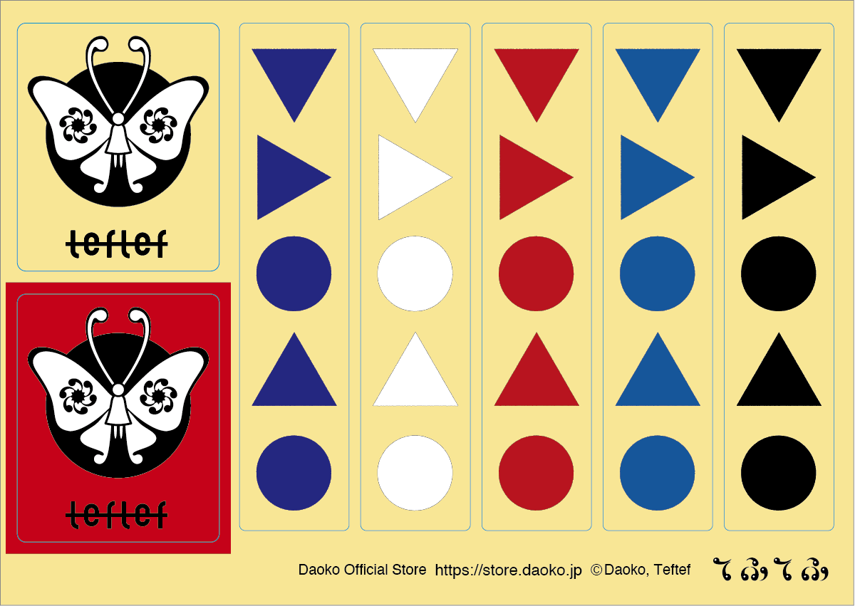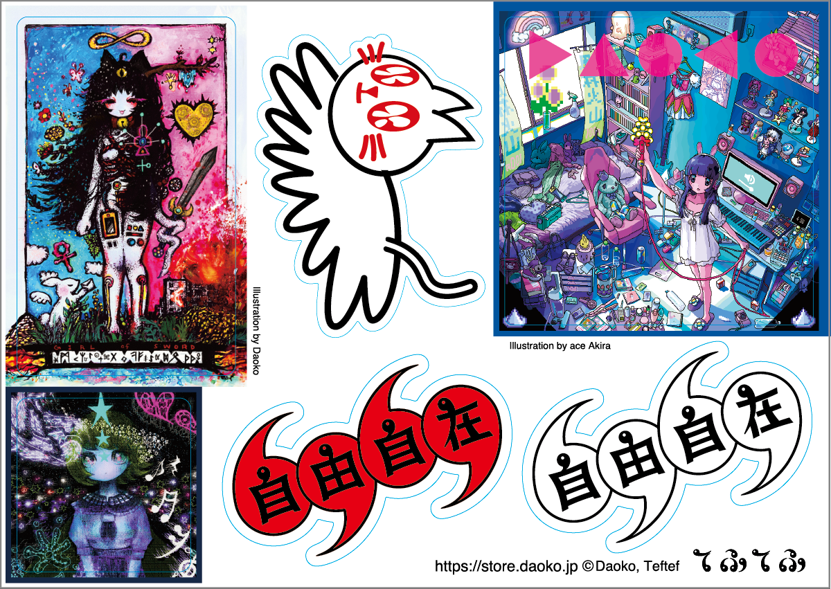 1枚目は、透明PET素材に色違いのDaokoロゴとてふてふマーク。2枚目は白PET紙にDaokoのイラスト、てふねこ、自由自在ツアーロゴ、「前世は武将」のジャケットイラストなどDaokoファンには欠かせないグラフィックをまとめました。